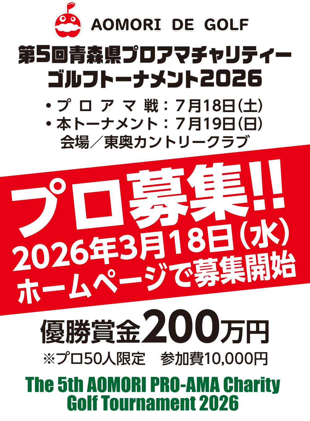 第5回青森プロアマチャリティーゴルフトーナメント2026の参加申し込みを受け付け中です。要項をご確認の上、お申込みくださいご参加お待ちしております。お申込みページ